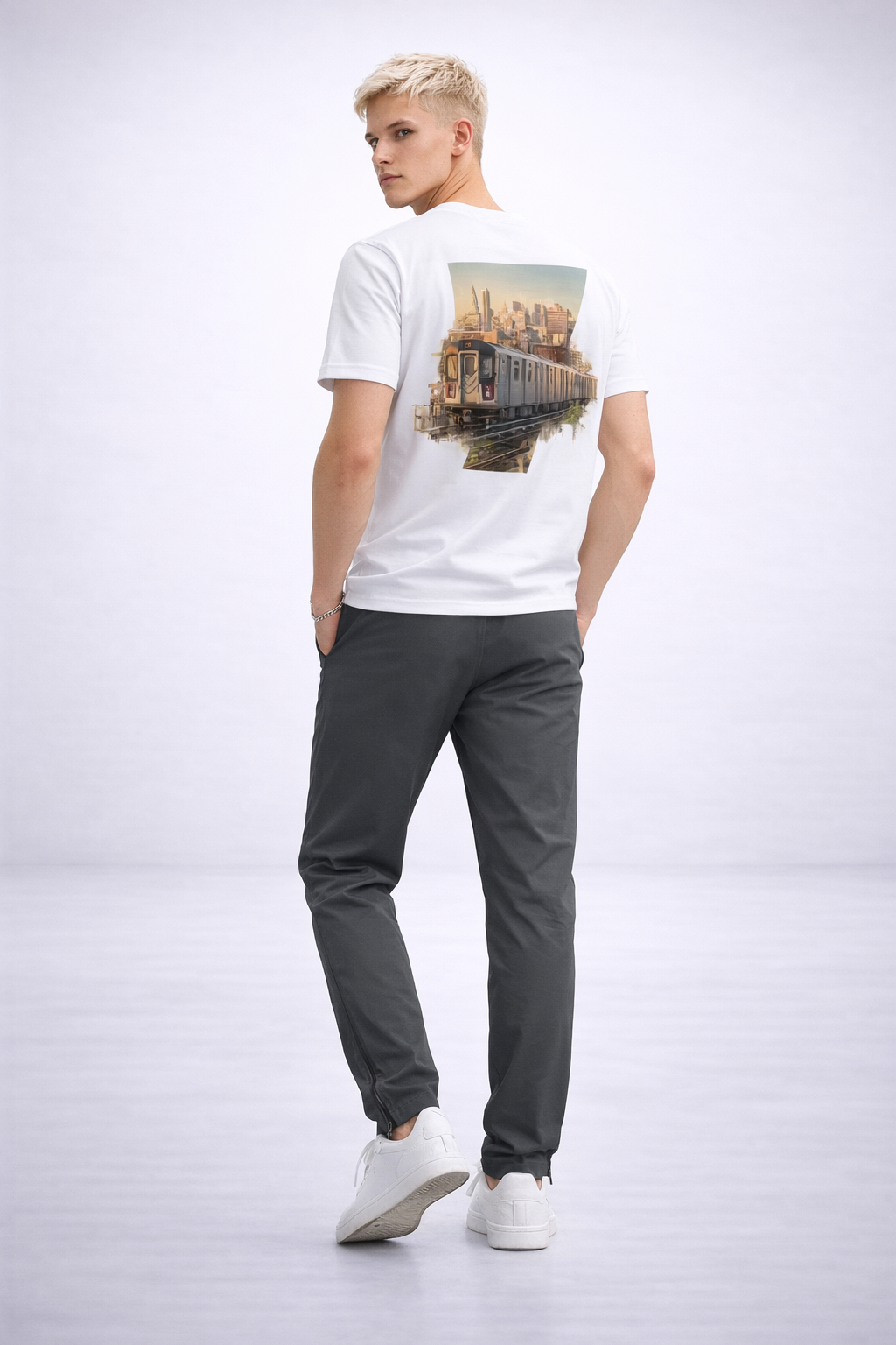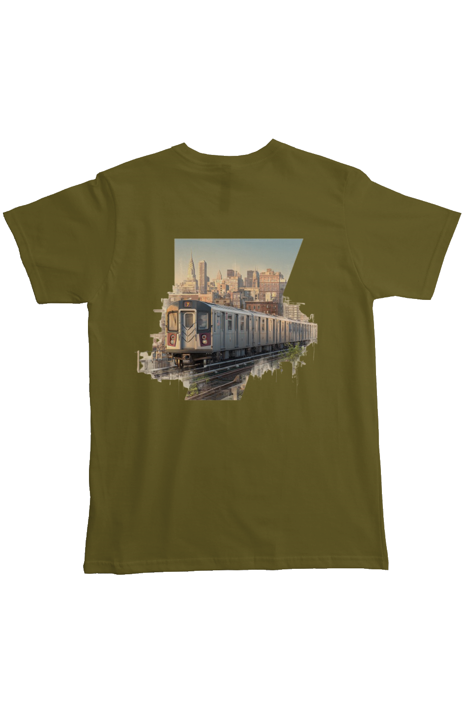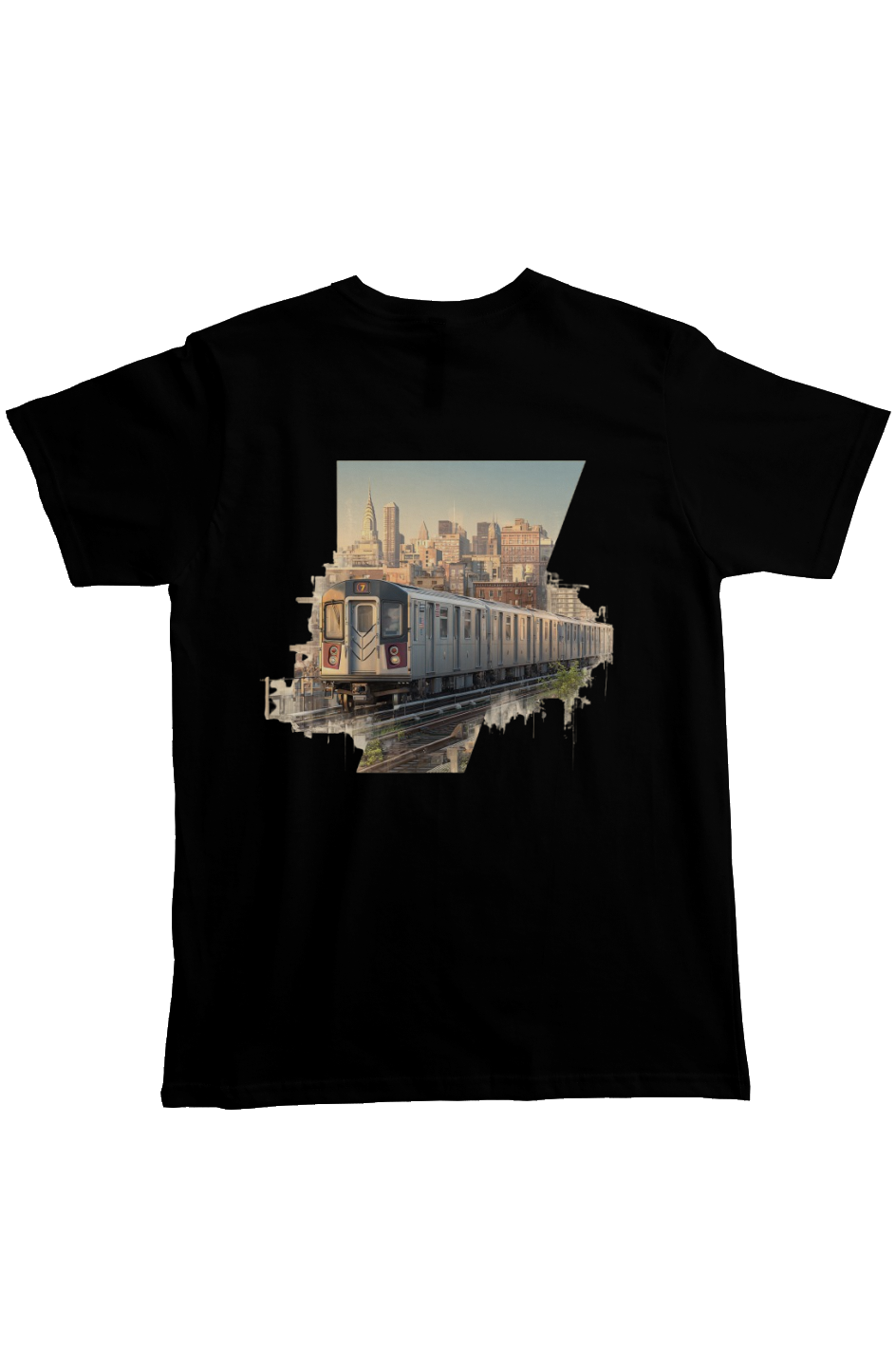 The graphic reflects movement through the city—an abstracted moment of transit, skyline, and direction—translated into a wearable design.